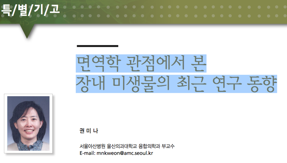 사람은 끊임없이 외부로부터 들어오는 병원체에 대처하기 위해 면역 (immunity) 반응을 유도하거나 관용(tolerance)을 이끌어 냄으로써 인체의 항상성을 유지한 다 [1]. 점막 면역 조직 (mucosal immune tissue)은 호흡기, 생식기 및 소화기에 이르는 점막으로 덮여있는 조직들을 말하고 이 조직들은 외부환경과 직접 연결되어 외부항원 및 병원체에 쉽게 노출되는 조직이다. 사람의 장내에는 1013~1014개에 이르는 세균, 곰팡이, 원생동물 등 다양한 미생물이 군집을 이루고 있으면서 사람의 총 세포수의 10배에 가깝다 [2]. 이러한 미생물을 microbiota라고 부르고, 그 유전자를 microbiome라고 명명하며 미생물 유전자를 사람의 2번째 유전자 (second genome)로도 부르고 있다.
