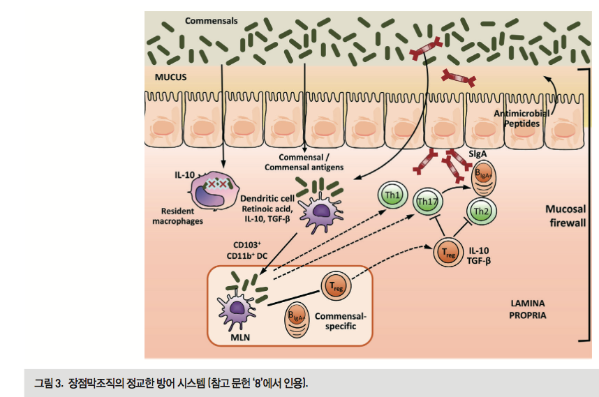 또한 enteroendocrine L cells로부터 분비되는 “incretin으로 대표되는 장 호르몬은 다양한 대사과정에 관여하는 것으로 알려져 있다. 한편 공생세균 혹은 세균유래 항원이 장벽을 통과하여 숙주내로 들어오게 되면 가장 먼저 조직에 상주하고 있는 대식세포 (macrophages)에 의해 처리되게 된다(그림3)[8]. 대식세포에 의해 처리되지 못한 것은 CD103+ CD11b+ 장 수지상 세포 (dendritic cells)에 의해 포획되어 장에서 장간막 임파절 (MLN; mesenteric lymph node)로 이동하여 장내 세균 특이적 인 Treg, Th17, IgA 분비 B 세포를 분화시키게 된다. 종합적으로는 장상피층, 점액층, SIgA, 면역세포들이 협력하여 장 점막조직에 방어벽 (Firewall) 을 형성하게 되고 숙주와 장내 공생 세균간의 균형을 유지하는데 기여하고 있다.
