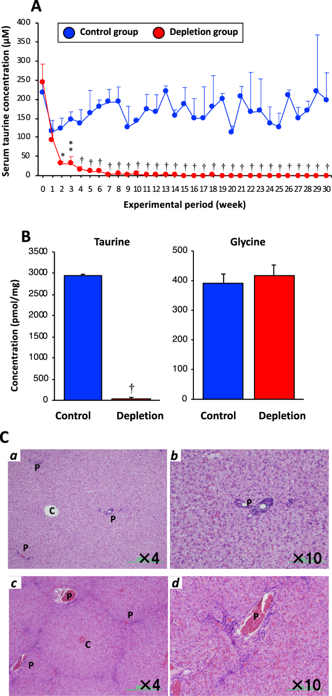 Taurine concentration in serum and liver, and histological observations of hepatic tissue. (A) Progress of serum taurine concentration during the experimental diet feeding for 30 weeks. (B) Taurine and glycine concentrations in the liver after the 30-week feeding. (C) H&E stain of hepatic tissue; (Ca & Cb) Overall hepatic lobule (objective × 4) and the portal region (×10) images in the Control group. (Cc & Cd) Overall hepatic lobule (×4) and the portal region (×10) images in the Depletion group. C and P in Fig. 1Cb and Cd show the central vain and portal vain, respectively. Data are the mean ± SE. *P < 0.05, **P < 0.01, †P < 0.001 versus the Control group at each point by unpaired Student t-test.