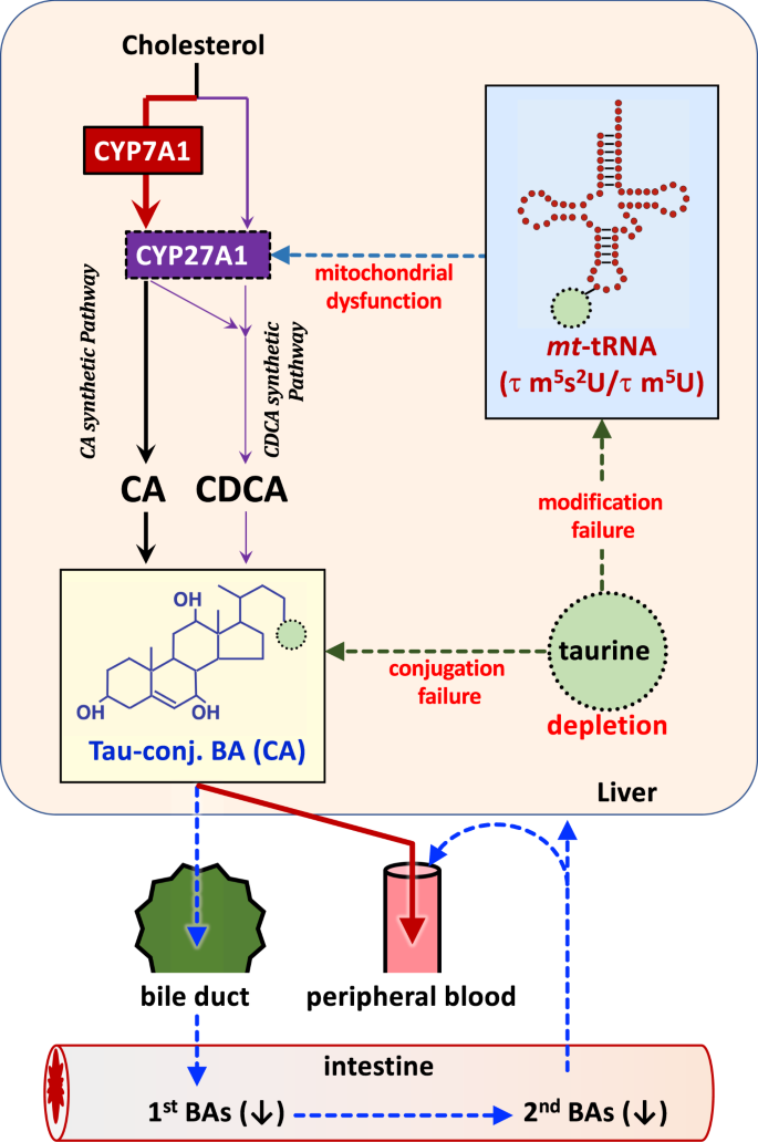 Defective BA metabolism in taurine depletion by impairments in mt-tRNA modification and in BA conjugation. Taurine depletion decreases the taurine modified mt-tRNAs, and in turn, CYP27A1 protein located on the mitochondrial inner membrane is decreased. Bile acid syntheses, particularly in CDCA synthesis, are decreased according to the accumulated substrates and decreased metabolites of CYP27A1. Bile acid excretion into bile is decreased, and instead, the excretion into the peripheral circulation is increased.
