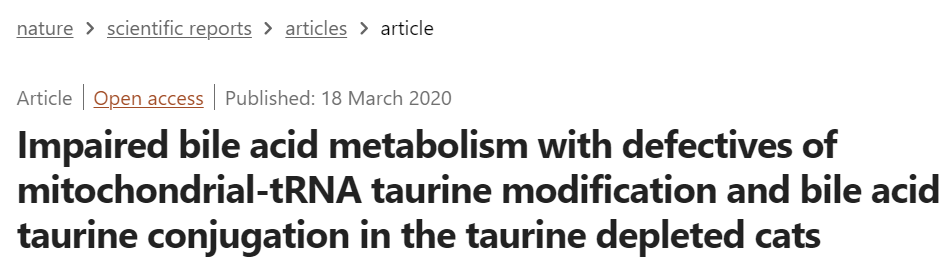 Impaired bile acid metabolism with defectives of mitochondrial-tRNA taurine modification and bile acid taurine conjugation in the taurine depleted cats