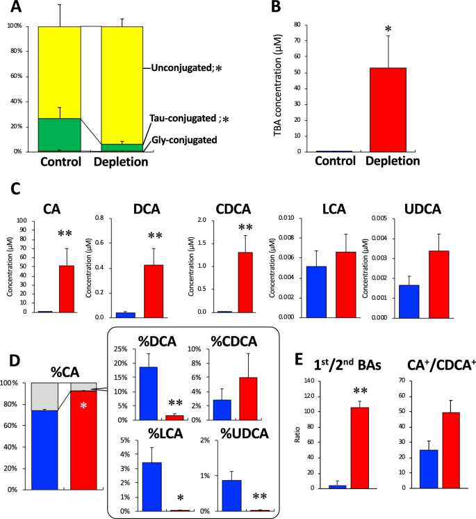 In serum, the BA proportions of unconjugated and taurine-conjugated forms were approximately 75% and 25%, respectively, in the Control group; however, these forms were significantly increased to 95% and significantly decreased to 5.5%, respectively, in the Depletion group (Fig. 3A). The glycine-conjugated forms in the both groups were less than 1% and were not significantly different. The serum TBA concentration was >200-fold higher in the Depletion group than in the Control group (53.0 ± 20.2 vs. 0.2 ± 0.08 µM, P < 0.05; Fig. 3B). Serum concentrations of CA, DCA, and CDCA were significantly increased in the Depletion group, compared to the concentrations in the Control group (Fig. 3C). The proportions of CA, CDCA, DCA, LCA, and UDCA in the serum were approximately 75%, 3%, 20%, 3%, and 1%, respectively, in the Control group (Fig. 3D). In the Depletion group, the primary bile acids CA and CDCA were increased to approximately 90% and 6%, respectively. However, the percentage of the secondary BAs were significantly decreased in the Depletion group, compared to the Control group (Fig. 3D). The primary/secondary BA ratio was significantly higher in the Depletion group than in the Control group, although the CA-derived BAs/CDCA-derived BAs ratio was not significantly different between the two groups (Fig. 3E).