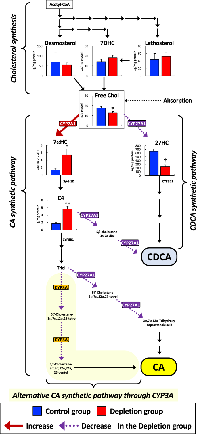 Free-cholesterol and oxysterol concentrations in the liver tissue. Bile acids are synthesized from cholesterol in the liver via two main pathways. In one pathway, cholesterol is initially converted to 7αHC by microsomal CYP7A1, which is the rate-limiting enzyme in BA synthesis. After several steps, the intermediate is then metabolized by mitochondrial CYP27A1 to finally yield CA. In another pathway, cholesterol is initially converted to 27HC by CYP27A1, and ultimately metabolized to CDCA. CDCA is also yielded by CYP27A1 from intermediates (e.g., 7αHC and C4) in the CA synthetic pathway. 7αHC, C4, and 27HC are the key intermediates through CYP7A1 and CYP27A1 in BA synthetic pathway. Lathosterol, 7-DHC, and Desmosterol are the intermediates in cholesterol synthesis. Data are the mean ± SE. *P < 0.05, **P < 0.01, †P < 0.001 versus the Control group by unpaired Student t-test. Abbreviations: 3β-HSD; 3β-hydroxysteroid dehydrogenase, 7αHC; 7α-hydroxycholesterol, 7DHC; 7-dehydroxycholesterol, 27HC; 27-hydroxycholesterol, C4; 7α-hydroxy-4-cholesten-3-one, CYP7A1; cholesterol 7 alpha-hydroxylase, CYP7B1; 25-hydroxycholesterol 7-alpha-hydroxylase, CYP8B1; 7α-hydroxy-4-cholesten-3-one 12α-hydroxylase, CYP27A1; cholesterol 27-hydroxylase, Free Chol; free-cholesterol, Triol; 5β-cholestane-3α,7α,12α-triol, and see the legend of Fig. 2 for other abbreviations.