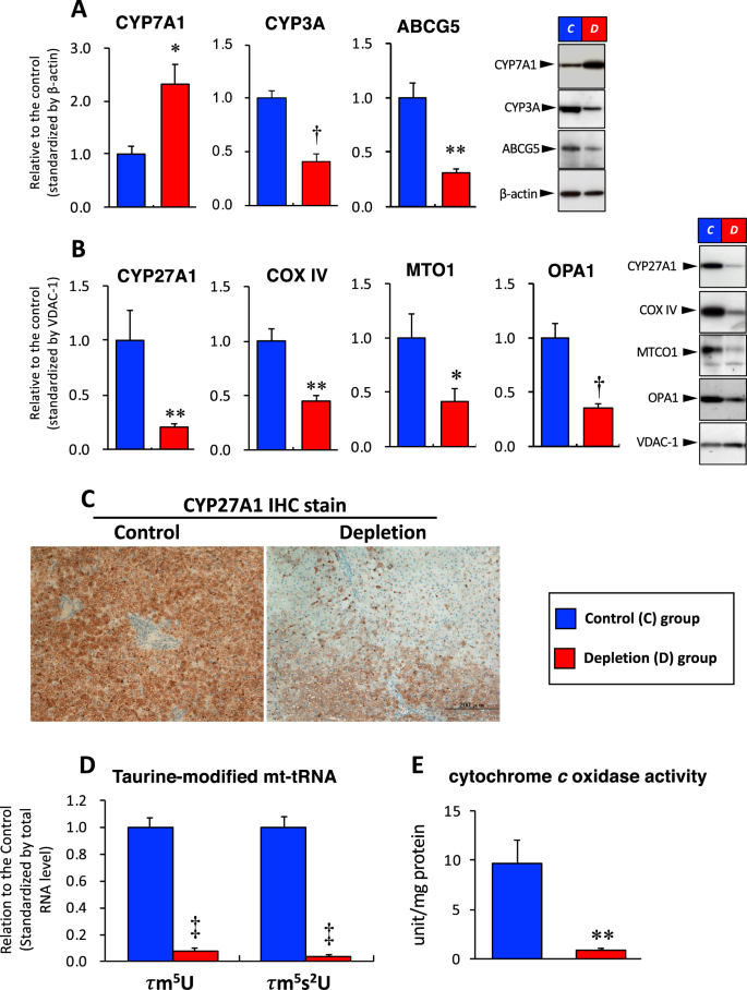 Bile acid synthesis-related protein expressions, taurine modified mt-tRNA levels and mitochondrial activity in the liver tissue. (A,B) The BA synthesis proteins expressed in the cytosolic (A) and mitochondrial (B) fractions analyzed by Western blotting. The protein expressions in the cytosolic and mitochondrial fractions were standardized by β-actin and VDAC-1 proteins, respectively. (C) Immunohistochemical stain of CYP27A1 in the liver tissue. (D) τm5U and τm5S2U levels in the liver. (E) Cytochrome c oxidase activity in the liver. The mt-tRNA level and mitochondrial activity were expressed as per the protein level. Data are presented as the mean ± SE. *P < 0.05, **P < 0.01, †P < 0.001, †P < 0.001versus the Control group by unpaired Student t-test. Abbreviations: COX-IV; cytochrome c oxidase subunit 4, mt-tRNA; mitochondrial-tRNA τm5U; 5-taurinemethyluridine, τm5S2U; 5-taurinemethyl 2-thiouridine, and see the legends of Figs. 2 and 4 for other abbreviations.