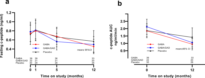 Fasting c-peptide (a) was measured in the three study groups (GABA-red, GABA/GAD-blue, and placebo-black) at baseline (Time = 0,prior any treatment) and at 1, 5 and 12-months thereafter. AUC c-peptide (b) was calculated over time in the three study groups. Results are given as mean ± 95% CI. No statistical differences were noted by two-sided analysis of covariance (complete statistical data is summarized in Supplementary Table 1). Source data are provided as a Source Data file.