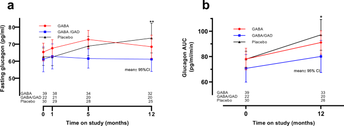 Fasting glucagon (a) was measured in the three study groups (GABA-red, GABA/GAD-blue, and placebo-black) at baseline (Time=0, prior any treatment) and at 1, 5 and 12-months thereafter. AUC glucagon (b) was calculated over time in the three study groups. Results are given as mean ±95% CI. Statistical differences were by two-sided analysis of covariance. a At 5 month GABA/GAD vrs. GABA, p = 0.007 and GABA/GAD vrs. Placebo, p = 0.086. At 12- months, GABA/GAD vrs. Placebo,**p = 0.035. Regarding AUC glucagon (b), at 12-months GABA/GAD vrs. Placebo, *p = 0.041. Source data are provided as a Source Data file.