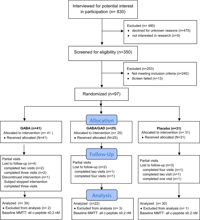 Participants were screened at the time of diagnosis with T1D, as defined by ADA criteria. All patients were enrolled from the clinics and in-patient wards at Children’s of Alabama (CoA), a tertiary care university-associated referral center. The majority of patients were residents of the state of Alabama. There were 11 out of state participants (AZ, GA, MS, MO, NC, ND, TX, VA). The first participant was enrolled 3/2/2015 and the last study visit was 6/24/2019. Inclusion criteria: children 4–18 years of age, positivity for autoantibody GAD65, and enrollment within 5 weeks of diagnosis. If the participant was female and not abstinent, two forms of contraception were required. Exclusion criteria: pregnancy, systemic or inhaled steroid use, neurologic/seizure disorders, adjunct oral therapies that might affect glucose or GABA metabolism26. Six randomized patients were excluded from analysis because all c-peptide values, fasting and MMTT stimulated, were <0.6 ng/ml at the initial baseline study visit64,65. Participants received a $60 gift card as compensation for every blood draw.