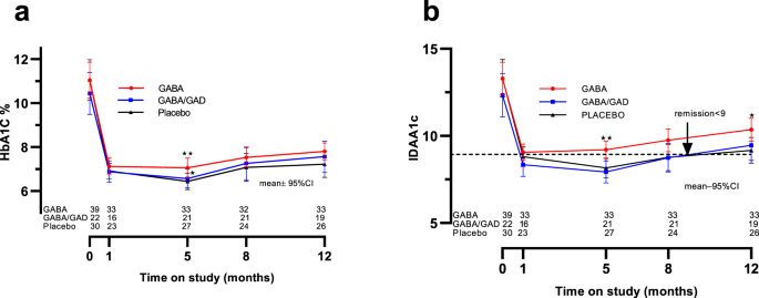 Glycosylated Hemoglobin (HbA1c) (a) and insulin adjusted A1c (IDAA1c) (b) were measured in the three study groups. Results are shown as mean ±95% CI and statistical comparisons were by two-sided analysis of covariance. Regarding HbA1c (a) at 5-months GABA vrs. Placebo **p = 0.003 and GABA vrs GABA/GAD *p = 0.041. For IDAA1c (b) at 5-months, GABA vrs. Placebo **p = 0.007 and GABA vrs. GABA/GAD **p = 0.002. At 12-months, GABA vrs. Placebo *p = 0.020. Source data are provided as a Source Data file.