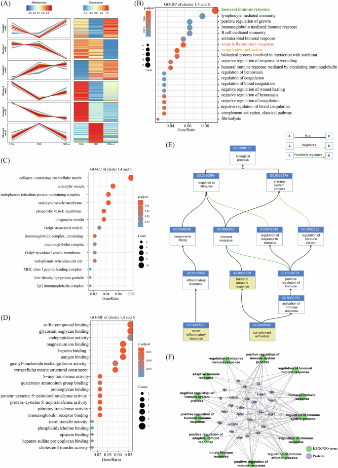 A Mfuzz cluster analysis of significantly changed proteins in CON, CRS, and CRS-H groups based on their change tendencies. Each fold line of Clusters 1 (n = 42), Cluster2 (n = 56), Cluster3 (n = 64), Cluster4 (n = 63), Cluster5 (n = 107) and Cluster6 (n = 36) indicated a change tendency of one protein. Proteins positioned in clusters 1, 4 and 6 were recognized as rescued or regulated by GABA. B–D The GO enrichment analysis of proteins in clusters 1, 4 and 6. B The top 20 most significant enriched entries in biological process (GO-BP) and C cellular component (GO-CC), and D top 15 in molecular function (GO-MF) were shown, and in the GO-BP analysis (B), the “humoral immune response”, “complement activation”, and “acute inflammatory response” were significantly enriched (p <0.001). E Ancestor chart from quickGO database (https://www.ebi.ac.uk/QuickGO/) showing the connections of the interested processes. F PPI analysis of proteins in clusters 1, 4 and 6 based on KEGG and GO databases and there were interactions between terms related to immune response and identified proteins.
