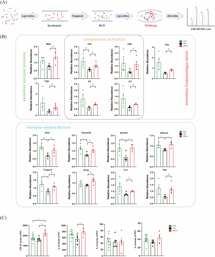 A The workflow of PRM analysis(Created with BioRender.com). B PRM validation was conducted on identified differential proteins. These validated proteins encompassed those involved in the three target categories, “complement activation”, “humoral immune response”, and “acute inflammatory response (C3, C4b, Cfh, Cfi, B2m, Fgb, and Pzp), as well as immune-related factors (Itih4, Rbfox3, Rnf157, Trappc3, Ubash3b, Fn1, Hpx, and Brap). (n = 3–5/group). C The impact of GABA intake on anti-inflammatory factors (IL-10, TGF-β1, IL-13, and IL-4) expression. In the CRS group, IL-10 and TGF-β1 levels decreased, but GABA reversed this decline significantly when given at 20 mg/kg(CRS-H). IL-4 levels had a trend to be lower in the CRS group, and GABA showed a trend to increase. IL-13 levels didn’t change significantly. (*p < 0.05; **p < 0.01 by one-way ANOVA, #p < 0.05 by unpaired t-test).
