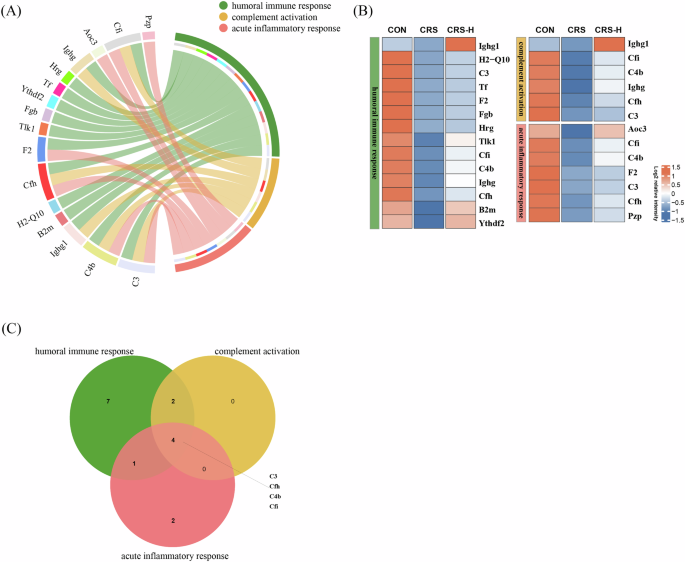 A Correlation networks between the interesting processes (humoral immune response” in green, “complement activation”in orange, and “acute inflammatory response” in pink) and proteins of clusters 1, 4 and 6 involved were showed clearly by chordal graph. B The heat map showed the relative intensity in proteomics of proteins of (A) involved in the three interesting processes. C The Venn diagram showed the connection between the proteins of (A) involved in the interested processes and C3, Cfh, C4b and Cfi were overlap in the three processes. CON normal control, CRS Chronic restraint stress, CRS-H Chronic restraint stress and GABA administration of a high dose(20 mg/kg).