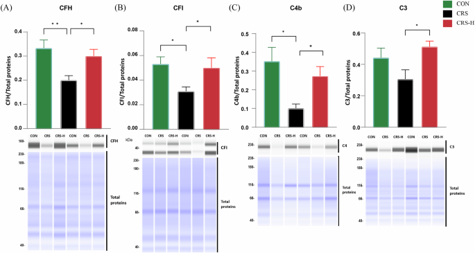 A–D Immunoblottings were used to display the protein expression levels of Cfh, Cfi, C4b, and C3, along with total protein as a loading control, in the CON, CRS, and CRS-H groups. Consistent with proteomic and PRM results, the CRS group exhibited decreased levels of Cfh, Cfi, C4b, and C3, with significant reductions observed in Cfh, Cfiand C4b. However, treatment with GABA at 20 mg/kg (CRS-H) significantly reversed this decline. Protein levels were quantified in each group (n = 6–8/group) and normalized to total protein concentration. *p < 0.05; **p < 0.01 by one-way ANOVA).