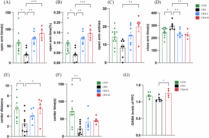 A–D GABA oral intake showed an anxiolytic effect on the CRS anxiety model mice in EPM in the time spent in open arms (B), % of time spent in the open arms (C), and open arms entries (D) in all GABA intake group in a dose dependent manner, and the time spent in close arms was significantly lower than CRS group (E). GABA oral intake showed an anxiolytic effect on the CRS anxiety model mice in OFT in both of the center distance (E) and center time (F) in a dose dependent manner. G GABA oral intake (20 mg/kg, CRS-H) significantly increased GABA levels in the GABA- reduced CRS group in the PFC. (*p < 0.05; **p < 0.01; ***p < 0.001 by one-way ANOVA).