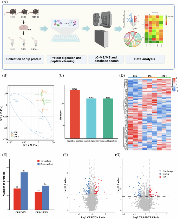 A Procedure of 4D-label-free quantitative proteomic analysis performed on the hippocampus (hip) tissues from the CON(normal control), CRS(Chronic restraint stress), CRS-H(Chronic restraint stress and GABA administration of 20 mg/kg) groups (n = 3/group)(Created with BioRender.com). B Principal component analysis (PCA) of CON, CRS, and CRS-H groups based on identified proteins. C A total of 33,769 peptides, 5392 proteins, and 5369 comparable proteins were identified. D The hot map indicated that the protein alteration of CRS group was partially reversed by GABA treatment. E The number of deferiential proteins (p < 0.05, fold change >1.3) in CRS/CON and CRS-H/CRS. F The vocano graph for the CRS/CON. G The vocano graph for CRS-H/CRS.
