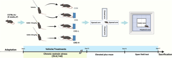 마우스는 대조군, CRS군, 두 개의 GABA 투여군(10 mg/kg, 20 mg/kg)으로 나누어졌습니다. 14일간의 투여 후, 고도화된 플러스 미로와 개방형 필드 테스트를 통해 불안 유사 행동을 평가했습니다.