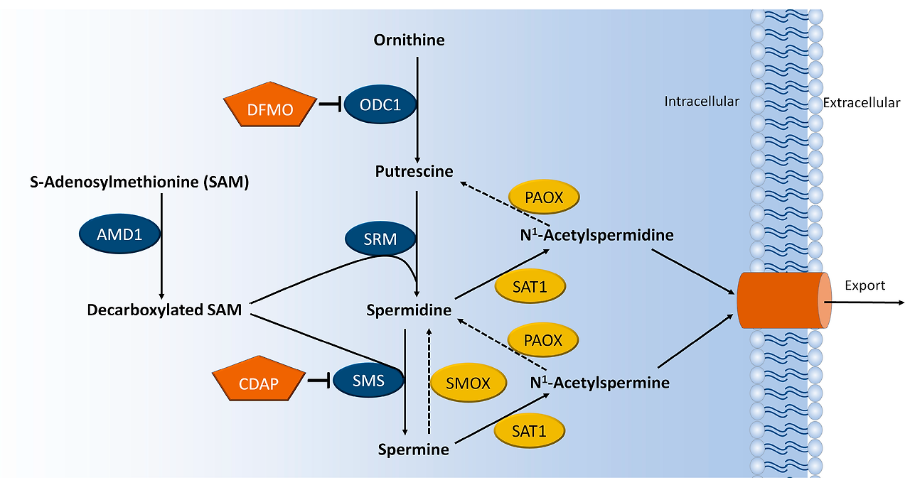 Polyamines, which are small polycationic compounds with a positive charge, are found in all types of living cells, including those of mammals, plants, and prokaryotes [1]. It is well known that there are three primary types of polyamines present in mammalian cells: putrescine (Put), spermidine (Spd), and spermine (Spm). The discovery of polyamines, specifically spermidine and spermine, dates back to 1678 when Antonie van Leeuwenhoek made the initial observation [2]. Throughout the twentieth century, their structure was characterized and their biosynthetic pathway was determined as a result of ongoing research [3]. Although all eukaryotic cells are capable of synthesizing the three major polyamines, polyamines can also be obtained through diet and other alternative sources [4], including intestinal bacteria. In addition, polyamines are essential for the growth and proliferation of mammalian cells and are intricately linked to biological processes, such as replication, transcription, translation, and post-translational modification, which modulate cellular proliferation, differentiation, apoptosis, and tumorigenesis [4, 5]. Briefly, polyamines within mammalian cells are irreplaceable, as the depletion of polyamines will completely halt cell growth and proliferation.