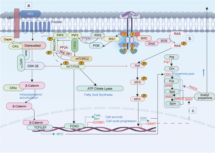 The regulatory pathways of polyamines in CRC. a Activation of the Wnt signaling pathway results in the inability of β-catenin to undergo phosphorylation by GSK-3β, ultimately leading to its accumulation within the cell and subsequent nuclear translocation. Upon entering the nucleus, MYC expression is upregulated through binding to TCF/LEF, which will increase the expression of ODC. B Excessive stimulation of the RAS signaling pathway results in the stimulation of ODC expression while suppressing the expression of SSAT. c. PI3K/AKT pathway can regulat the Wnt and Ras signaling pathways. Elevating the expression of ODC and reducing the expression of SSAT will result in an augmented intracellular pool of polyamines. The elevation in polyamine concentration frequently correlates with an unfavorable prognosis. Created with BioRender.com