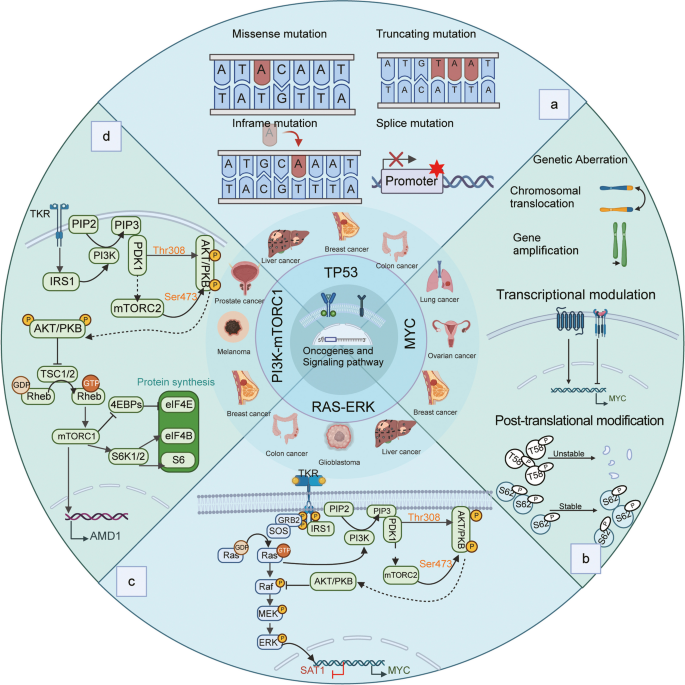 Regulation of polyamine by oncogenes and signaling pathways. a The translation product of TP53, known as p53, regulates the expression of ODC, a key enzyme in polyamine synthesis. Mutations in the TP53 gene will have a significant impact on the metabolism and function of polyamines. The tumor suppressor gene TP53 can be inactivated in four ways: Missense mutation; Truncating mutation; Frameshift mutation; Splice mutation. b Activated MYC exerts regulatory effects on several crucial enzymes involved in polyamine metabolism, including ODC, SRM and SMS. Genetic aberrations, transcriptional regulation, and protein instability can activate MYC. Increasing phospho-serine 62 (P-S62)-MYC and decreasing phospho-threonine 58 (P-T58)-MYC stabilize MYC protein. c. RAS-RAF-MEK-ERK signaling pathway upregulates the expression of ODC and downregulates the expression of SSAT. d PI3K-mTORC1 signaling pathway increases the expression of dcAdoMet, thus regulating the biosynthesis of polyamine. Created with BioRender.com