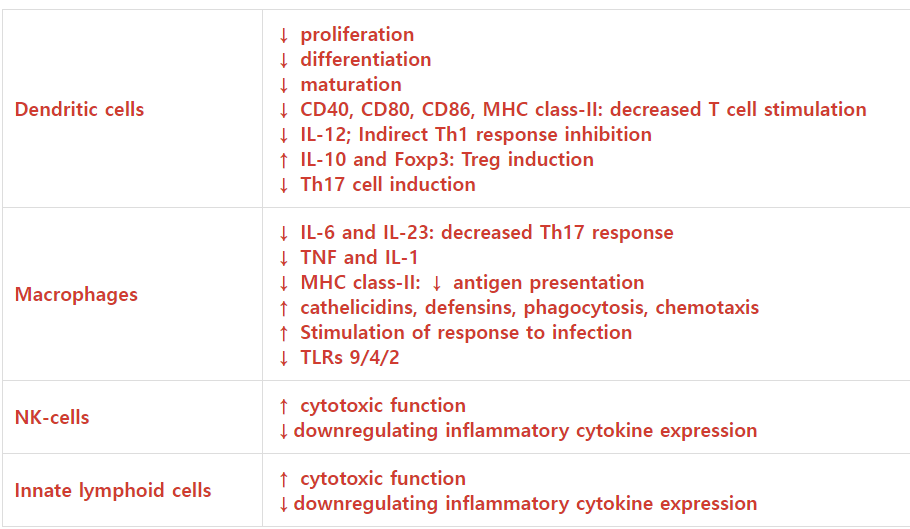 선천적 및 후천적 면역 세포 반응을 조절할 뿐만 아니라