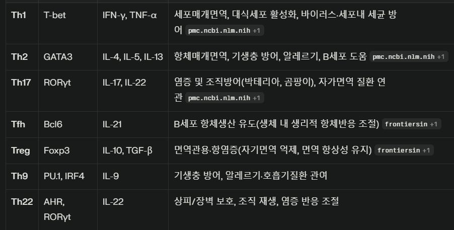 Th2: 기생충·알레르기, IL-4/5/13, B세포 도움
