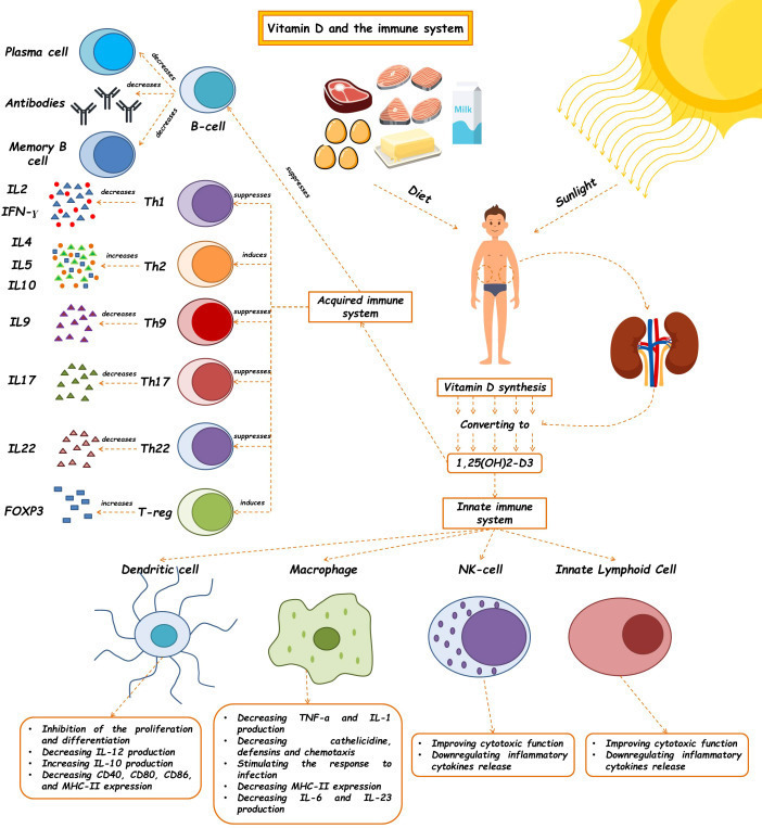 비타민 D는 선천적 및 후천적 면역 체계 전반에 걸쳐 B 세포, T 세포, 수지상 세포, 대식세포를 표적으로 삼을 수 있는데, 이는 이들 모두 VDR(비타민 D 수용체)을 발현하기 때문이다(251). 생체 내(in vivo) 및 시험관 내(in vitro) 연구에 따르면 비타민 D는 수지상 세포에서 IL-10 발현을 증가시키고 대식세포의 카텔리시딘 생성을 촉진할 수 있다(71, 252). 반면, 활성화된 형태의 비타민 D는 대식세포와 수지상 세포에서 톨 유사 수용체(TLR) 및 IL-12 발현을 억제합니다(29, 253). 이 억제는 수지상 세포에 의한 T 세포 활성화 감소로 이어집니다. 또한 비타민 D는 B 세포와 T 세포 증식을 직접 억제할 수 있습니다(50). 비타민 D는 염증성/항염증성 사이토카인 생산 균형에 개입하여, T 세포 염증성 사이토카인(IL-2, 인터페론(IFN)-γ, IL-17, TNF-α 등) 생산을 감소시키고, 조절 T 세포의 IL-10 및 Th2 세포의 IL-4와 같은 항염증성 사이토카인 생산을 증가시킬 수 있다(50, 254–256). 전반적으로 Tregs 및 CD8αα와 같은 조절 세포의 유도가 증가했습니다 (255, 257).