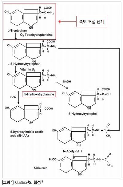 음식으로 섭취된 트립토판은 두 단계를 거쳐 세로토닌으로 합성.