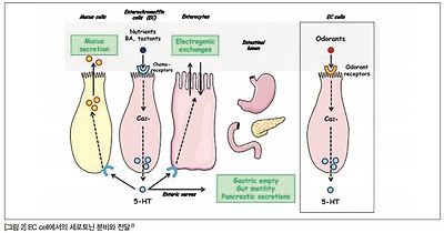 세로토닌의 분비를 이해하기 위해 그림2를 살펴볼 필요가 있다. 제일 오른쪽 그림은 EC cell에서의 일어나는 반응으로 음식 냄새(후각)가 후각 수용체와 결합하면 칼슘의 농도가 갑자기 높아지면서 세로토닌이 분비되는 것을 보여준다. 왼쪽 그림 가운데도 EC cell의 세로토닌 분비 메커니즘을 설명하고 있는데, 영양소나 담즙, 미각자극물질이 수용체와 결합하면서 세로토닌이 분비된다.