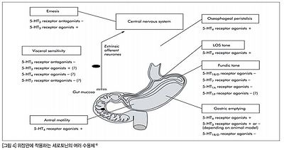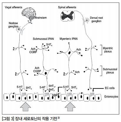 장의 자극 인지는 내인성 신경과 더불어 외인성 감각경로에 존재하는5-HT 수용체에 의해 매개된다.(nodose ganglion, dorsal root ganglion) (그림 3)