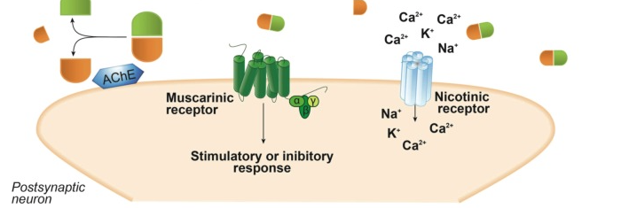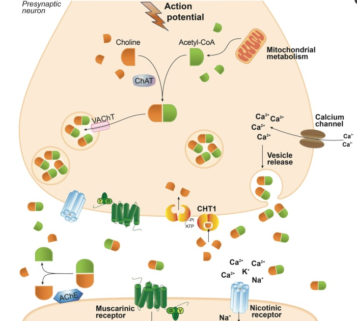 Acetylcholine (ACh) was the first neurotransmitter to be identified [1]. ACh is the neurotransmitter used by all cholinergic neurons, which has a very important role in the peripheral and central nervous systems. All pre- and post-ganglionic parasympathetic neurons and all pre-ganglionic sympathetic neurons use ACh as neurotransmitter. In addition, part of the post-ganglionic sympathetic neurons also uses ACh as neurotransmitter.