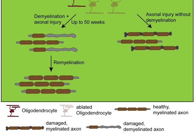 Despite the differences in the ablation approach and possibly the functional readout, all studies have in common that the death of myelinating oligodendrocytes leads to a primary demyelination with a persisting secondary induced axonal damage and a subsequent spontaneous remyelination (Figure Figure44). In most of the studies the demyelination and the axonal damage are accompanied by severe motor dysfunctions like tremor, ataxia as well as weight loss or even the development of seizures. Although there is a severe loss of myelin and an accumulation of myelin debris, one study reported about the absence of the development of an autoimmune-response, what is generally thought to happen during MS pathology (Locatelli et al., 2012). Due to the widespread myelin loss, the biology of these models all together creates a perfect tool for studying remyelination besides analyzing the outcome of oligodendrocyte death. Interestingly, Oluich et al. (2012) reported the loss of oligodendrocytes with axonal damage but without a severe and widespread demyelination, supporting the idea of a further function of oligodendrocytes providing a trophic support to axons. A possible reason for the different outcomes might be the recombination efficiency: while the ablation rate reached between 50 and 80% in most studies, the latter one ablated less than 30% of the oligodendrocytes that might not be enough to result in a global demyelination but already induce some axonal damage.