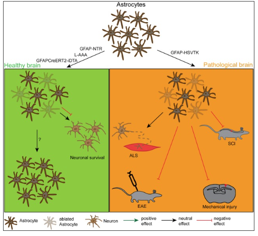 In summary, the ablation of astrocytes under pathological conditions has given a clear functional readout for the first time: astrocytes play a crucial role in the maintenance of the diseased tissue and in the inhibition of secondary tissue damage by blocking inflammation (Figure Figure22; Table Table22). This interpretation has to be taken with care, as only proliferating astrocytes were ablated in all the approaches described above, while the non-proliferating cells retained normal function that might be different or even opposing to that of the proliferating ones. Moreover, it is now textbook knowledge that although scar forming astrocytes are beneficial to injury, they also have detrimental effects on tissue regeneration (Pekny and Pekna, 2014; Sofroniew, 2015). These aspects were only slightly addressed in the experiments mentioned above, giving space for further ablation approaches in the future.