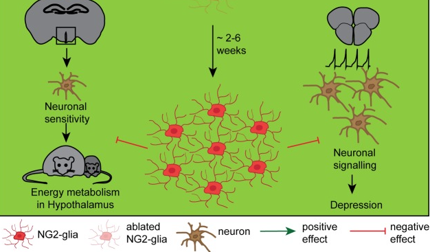 These first ablation studies fundamentally characterized the repopulation capacity of NG2-glia, but did not answer the question about the NG2-glia function in the adult brain. Two recently published NG2-glia ablation studies have so far directly addressed the functional outcome of an at least transient lack of NG2-glia (Birey et al., 2015; Djogo et al., 2016, see also Figure Figure33). Birey et al. (2015) reported that NG2-glia secrete the fibroblast growth factor 2 (FGF2) that directly influences the neuronal glutamatergic transmission and the astrocytic glutamate uptake in the prefrontal cortex. Ectopic DT application in NG2Cre/iDTR mice expressing the DTR under an ubiquitous promoter whose expression is driven by the NG2-promoter, induced a selective ablation of 80% of NG2-glia in the prefrontal cortex and resulted in a reduced FGF2 cell-to cell signaling what induced a depression-like behavior in the ablated mice. This work therefore indicates that NG2-glia have a direct influence on the functionality and the properties of the neuronal network. The mechanisms of this interaction still remains, however, a speculation. Djogo et al. (2016) used different methods to successfully ablate NG2-glia in the hypothalamus (ranging from 50% in general to 100% in the treated area): (1) AraC infusion into the 3rd ventricle, (2) genetically induced apoptosis that is driven by the lack of a necessary cell cycle protein Esco2 in NG2-glia, as well as (3) X-irradiation. In this work, it could be demonstrated that under physiological conditions NG2-glia in the hypothalamus contact dendritic processes of leptin receptor neurons which degenerate upon NG2-glia ablation, reducing leptin signaling. Hence, NG2-glia are essential to maintain the function of leptin receptor neurons in the hypothalamus, therefore proving for the first time a direct role for NG2-glia in the maintenance of the thalamic energy metabolism.