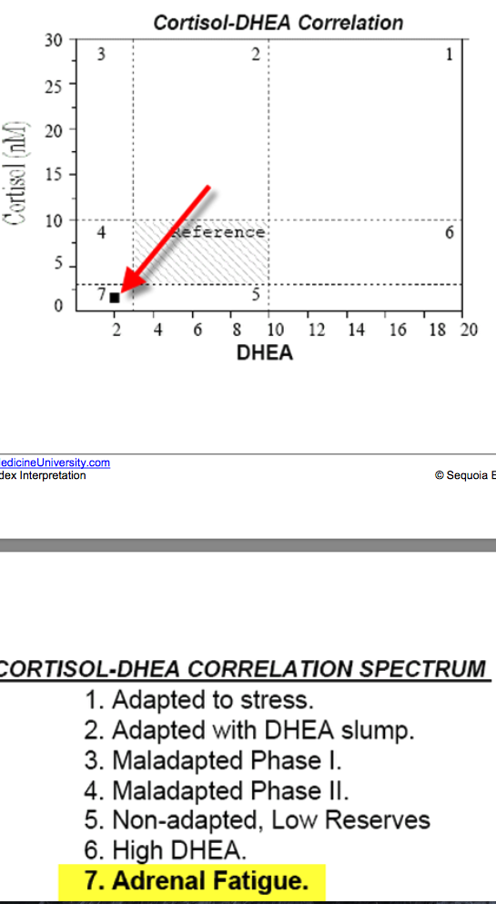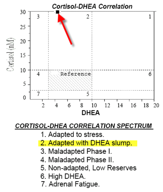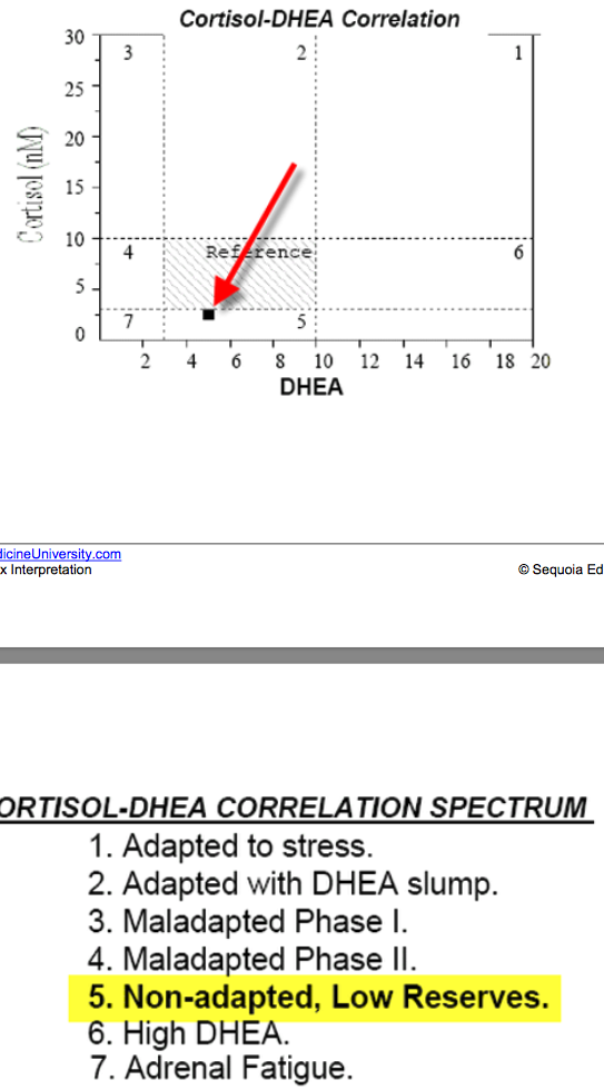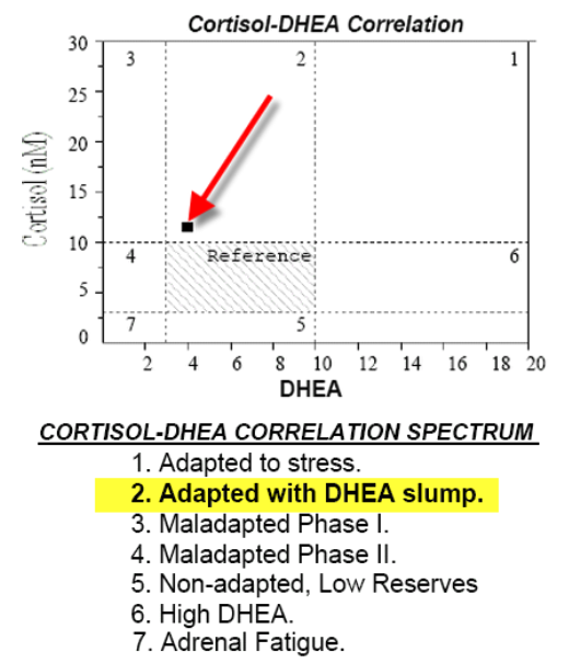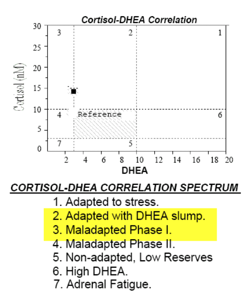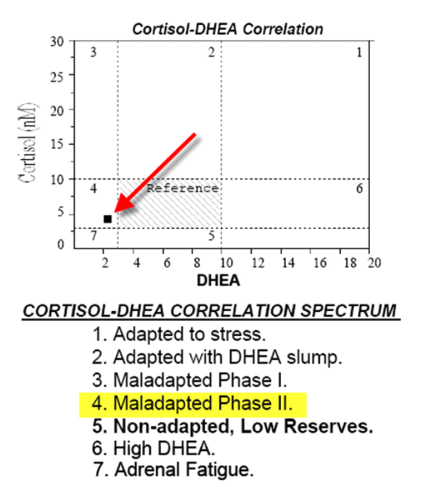 - 아침, 점심, 저녁 종합 코티졸 양 또한 미달되며 DHEA는 저하 또는 경계에 속함. 인체는 더이상 외부적인 스트레스를 감당할 수 없는 자율신경 조절장애와 호르몬 장애가 있게 되며 부신과 연관이 없어 보인는 증상들도 나타나고 전반적인 인체기능저하가 생김.