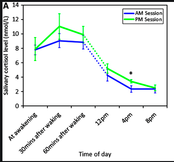 - 코티졸 각성반응은 호흡, 맥박, 체온, 호르몬 분비 등을 조절하는 생체리듬의 일주기 리듬을 반영하는 뚜렷한 지표임.