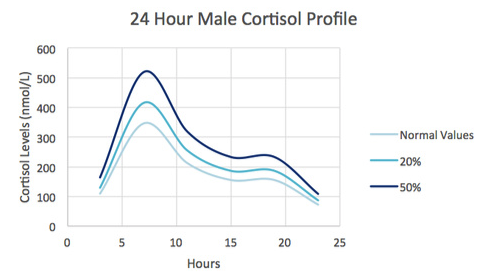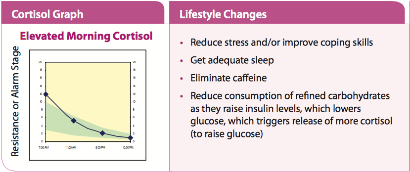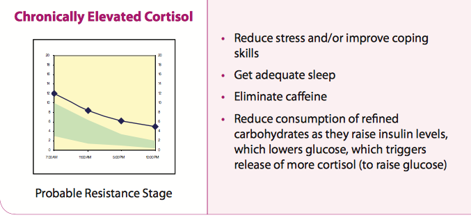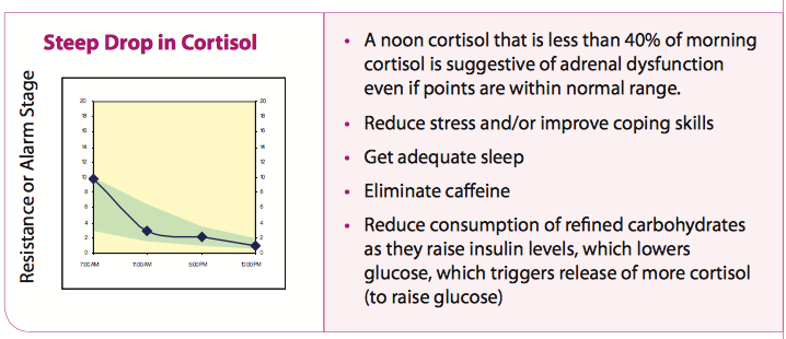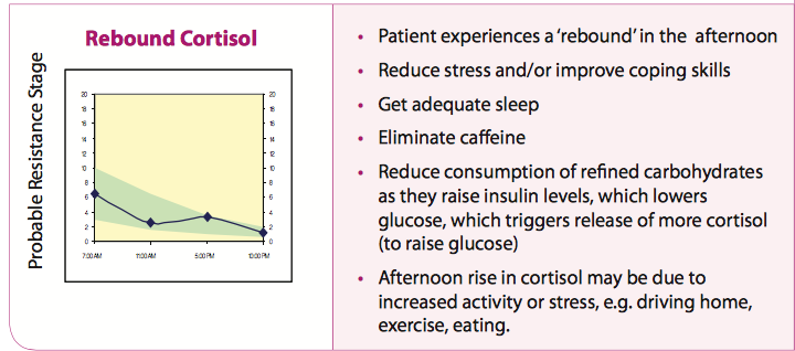 - 코티졸 저하증/고갈패턴, 아침 코티졸 상승은 억제되어 더이상 반응이 없으며 전체적인 일일변화 주기또한 낮게 나타남. 이는 부신의 쇠퇴, 예비저장고갈을 나타냄