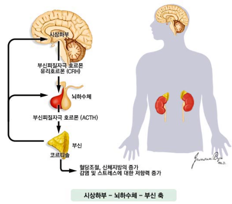 - 코티졸 수치는 지속적인 스트레스에 대응하기 위해 지속적으로 상승하므로 부신에서 지속적인 코티졸 분비가 일어남. 하지만 이에 상응하는 DHEA 수치는 저하되어 나타남.