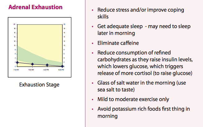 - 장기간 흥분자극 촉진이 부신에 지속적인 영향을 끼쳐서 코티졸 생성과 DHEA 생성부족을 나타내고 많은 건강상의 부신피로 증상이 나타나므로 의료진의 도움을 청하게 됨.
