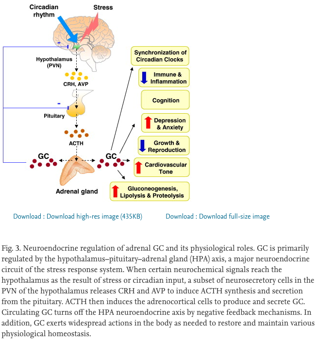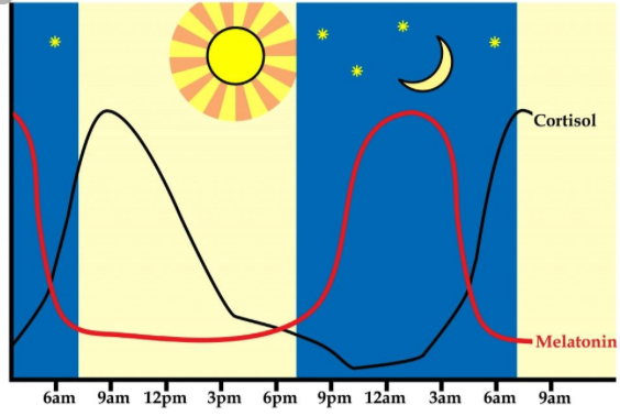 - 눈을 통해서 들어가는 빛으로 이 경로는 시작되어 부신을 촉진하는 원동력이 됨. 다시 말해 건강한 부신으로 일주기의 패턴이 제대로 유지되어야 코티졸 각성반응이 적절히 일어나고 낮잠을 잔 후 또는 밤잠을 자다가 깬 후에는 나타나지 않음.