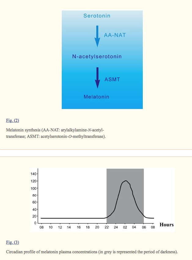 - 멜라토닌은 뇌의 송과선에서 생성되고 분비되는 호르몬임. 밤의 멜라토닌 수치의 변동은 수면상태와 불면상태 적용에 관여하며 낮동안의 멜라토닌 농도는 낮게 나나탐.