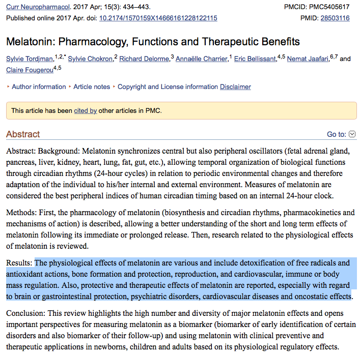 - 멜라토닌과 멜라토닌 대사물은 강력한 항산화 역할을 하며 자유라디칼(유리기) 제거제 역할과 함께 항산화 효소의 활성을 돕는 역할