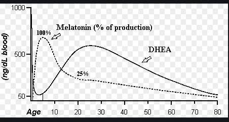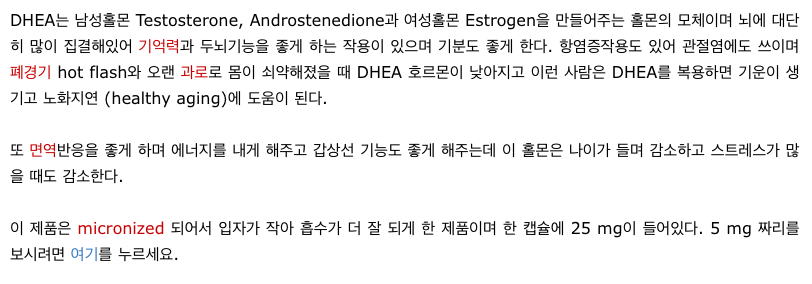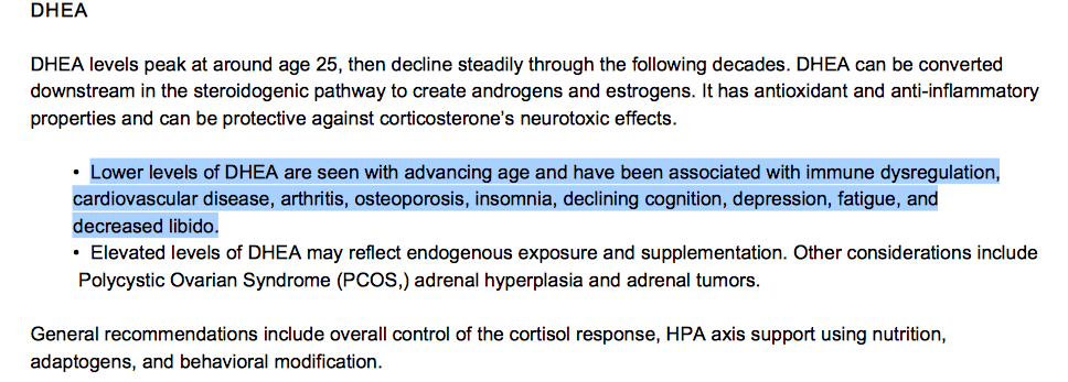 - Dehydroepiandrosterone는 부신에서 생성되는 호르몬으로 에너지 생성과 혈당 균형에 중요한 역할을 하며 뇌와 피부에서 소량 만들어짐. DHEA는 성호르몬인 안드로겐과 에스트로겐으로 전환되는 전구물질이고 부신 호르몬인 코티졸로도 전환됨. DHEA는 30대부터 서서히 생성이 줄어들기 시작하여 70대가 되면 최대량의 25%정도로 감소되고 면역기능, 성장/단백질 조직의 회복(특히 근육) 그리고 많은 대사(당질코르티코이드, 항염증, 이화작용, 항산화작용, 뼈건강, 심혈관 보호, 신경계 보호, 에너지 생성)에 관여함.