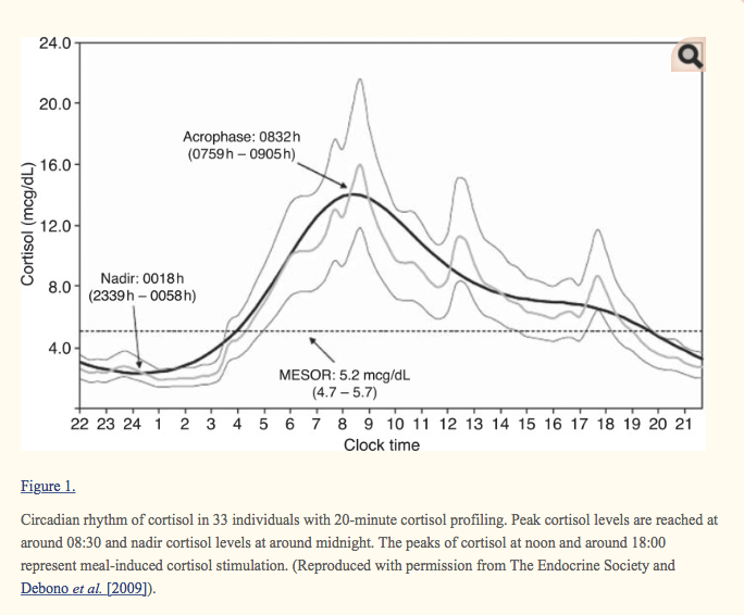 - 코티졸은 부신의 가장 대표적인 글루코코티코이드(단백질, 탄수화물, 지질의 대사에 작용하는 스테로이드 호르몬)이며 하루 24시간 동안 주기(아침에 제일 높고 저녁에 낮아짐)를 나타냄.