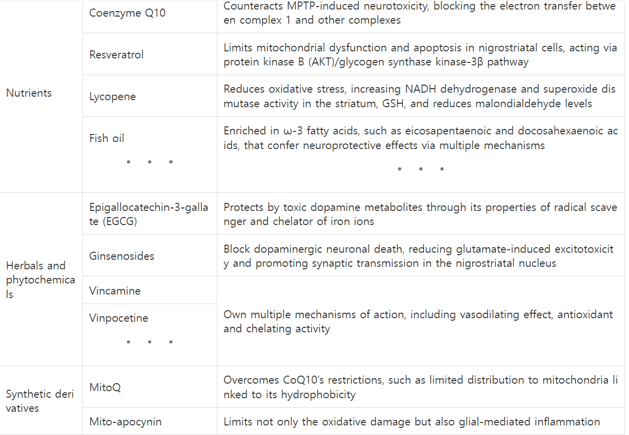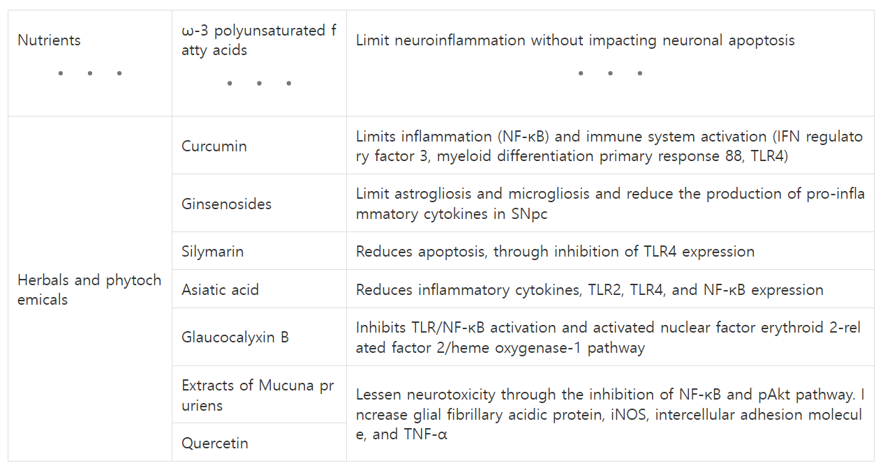 본 리뷰에서는 파킨슨병 발병 및 진행에 관여하는 여러 병원성 경로에 효과적인 몇 가지 주요 영양 성분과 식단 수정에 초점을 맞추고, 파킨슨병 예방 및 치료에 이러한 영양 성분을 사용할 수 있는 근거를 강조합니다.
