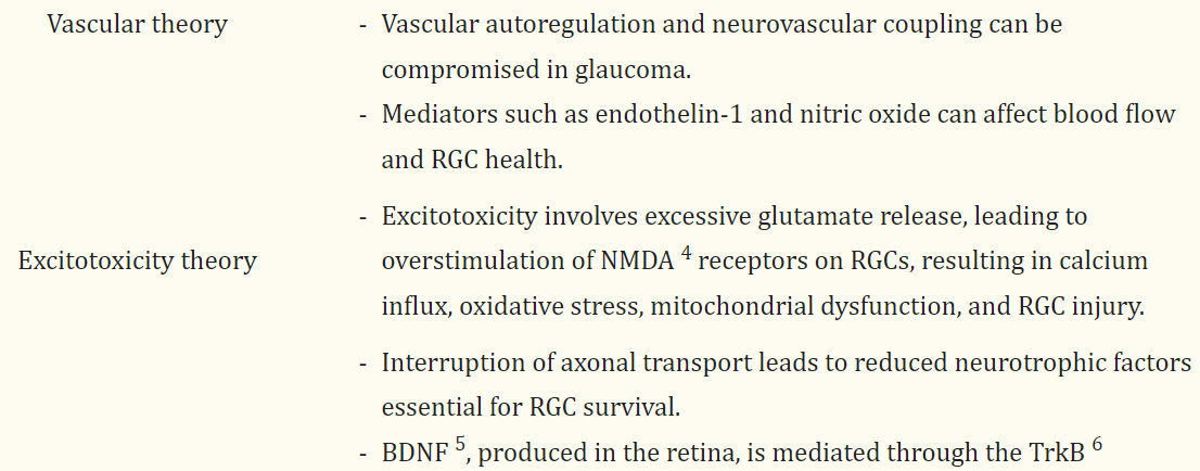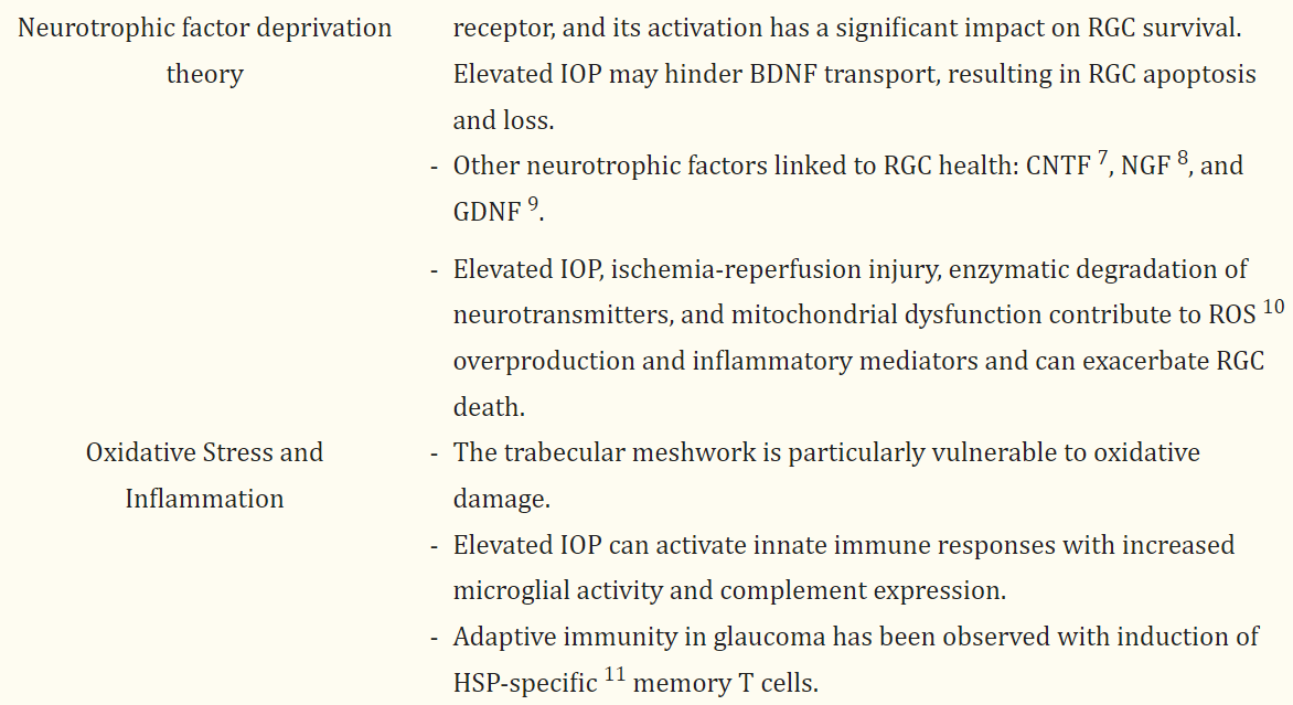 elevated IOP, impaired mitochondrial activity, oxidative stress, activation of glial cells, and excitotoxicity.