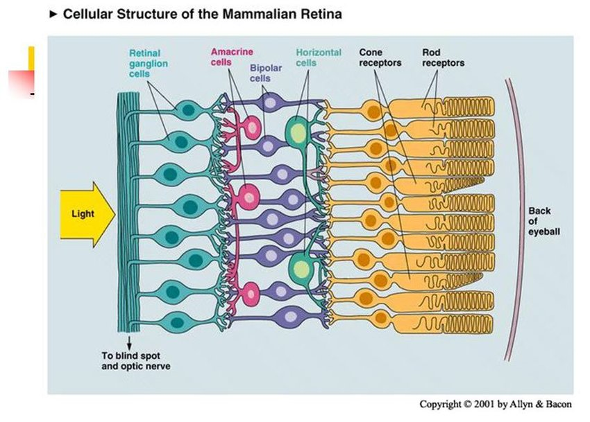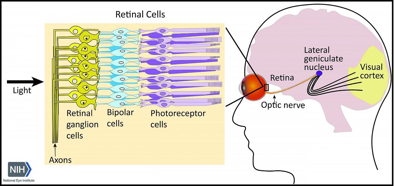 계층적 회로의 존재는 RGC가 복잡한 신호 통합 및 처리에 관여하여 광수용체 반응을 활동 전위로 전환할 수 있도록 합니다. 활동 전위는 시신경을 구성하는 RGC 축삭돌기를 통해 전파됩니다. 이들은 시신경 디스크와 시도를 통해 이동하여 시상에 위치한 측생식핵(LGN)에서 시냅스 연결을 형성합니다[6]. 시각 정보는 더 높은 수준의 처리와 통합을 위해 LGN에서 일차 시각 피질(V1)로 전송됩니다. 따라서 RGC는 망막의 초기 빛 감지를 다음 단계의 뇌 시각 지각으로 연결하는 데 중요한 역할을 합니다.