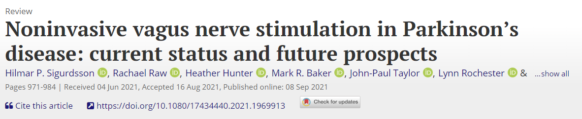 AJ Yarnall is an NIHR BRC Intermediate Clinical Fellow and has received research grants from Parkinson’s UK, Dunhill Medical Trust, Lewy Body Society, Weston Brain Institute, Intercept Pharmaceuticals, NIHR, Cure Parkinson’s Trust, EU IMI, and Michael J Fox Foundation and Dunhill Medical Trust. For AJ Yarnall’s current research program, ElectroCore, LLC, supplies nVNS devices free of charge but have no intellectual input. AJ Yarnall has received honoraria and support for attending educational meetings from GE Healthcare, Bial, UCB, Abbvie, Britannia, Teva-Lundbeck, and Genus. MR Baker has received research funding from the MRC, NIHR, Ataxia UK, Academy of Medical Sciences, and the William Leech Charity. ElectroCore LLC previously provided gammacore devices to Dr. Baker at no cost and without restriction for experimental studies conducted in his laboratory. J-P Taylor is supported by Newcastle NIHR BRC. He has received speaker fees from GE Healthcare, funding from Sosei-Heptares and has consulted for Kyowa-Kirin. L Rochester’s research program is supported in part by grants from, among others, Parkinson’s UK and Cure Parkinson’s Trust. The authors have no other relevant affiliations or financial involvement with any organization or entity with a financial interest in or financial conflict with the subject matter or materials discussed in the manuscript apart from those disclosed.