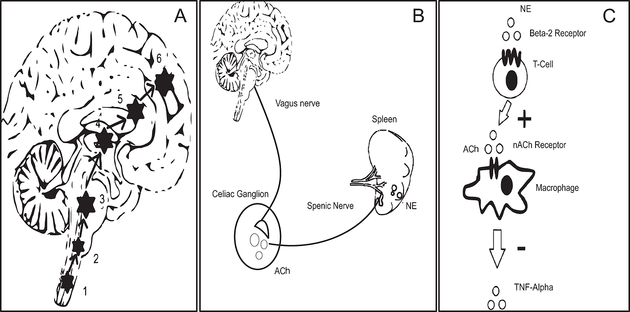 또한 이 과정은 ACh(α7nAChR 아형을 통한)와 미주 신경을 통해 비장에서 발생한다는 이론도 있습니다[인용36,인용90,인용91] - 그림 1 참조.