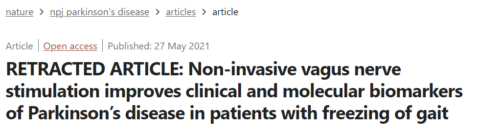 In summary, tcVNS may have beneficial neuromodulatory effects on treatment-resistant gait characteristics and falls in PD. Potential putative mechanisms could be reduced neuroinflammation, reduced α-synuclein aggregation, increased neurotropic factor signaling and/or upregulated cholinergic neurotransmission. The use of a non-pharmacological adjunct to rehabilitate to improve gait in Parkinson’s is an intriguing development, which merits further exploration. A larger randomized sham-controlled, multi-dose tcVNS study is currently being trialed in our group (ISRCTN19394828).