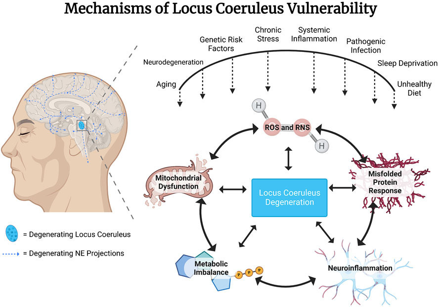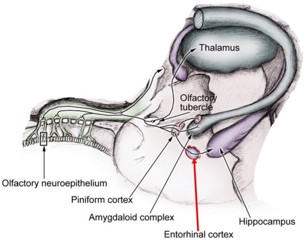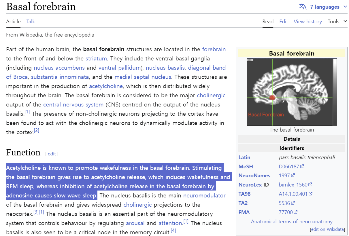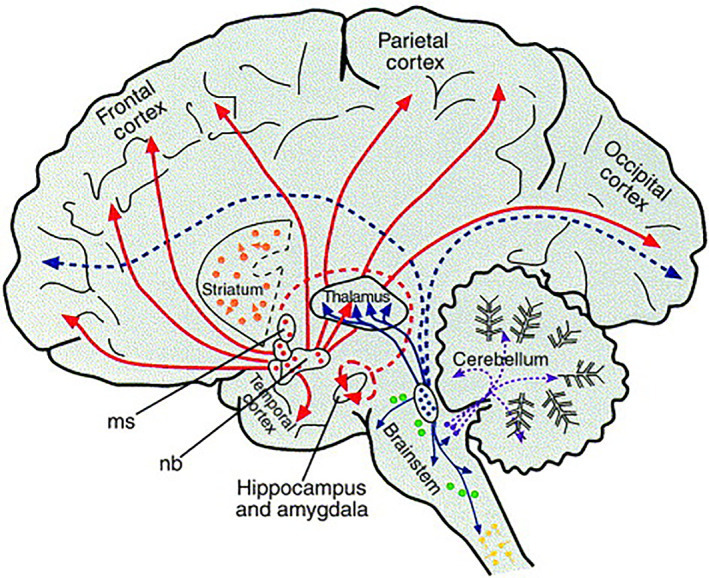 흑질(SN), 청반 locus coeruleus (LC), 편도체, 해마, 내후두피질 및 기저 전뇌의