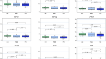 DTI data were processed using the FMRIB Software Library (FSL, http://www.fmrib.ox.ac.uk/fsl) and MRtrix3 (www.mrtrix.org). First, skulls were stripped from the DTI data for each participant. Then, topup and eddy were executed to correct susceptibility-induced distortions, eddy currents, and movements in diffusion data45. According to previous study, free-water was calculated by fitting a bi-tensor model46. The signal attenuation of the water molecules caused by and extracellular and intracellular water was predicted by this model, respectively. The derived free-water image reflects the volume fraction of extracellular space water. The steps to extract the free-water measure of above brain regions were as follows: 1) the native T1-weighted images were linearly and non-linearly aligned into Montreal Neurological Institute (MNI) standard space, and the outputs were visually inspected for errors and bad registration (4 PD patients and 1 healthy control were excluded in the following analysis); 2) the b0 images were linearly aligned to native T1-weighted images, and the free-water images were projected onto the T1-weighted images; 3) the free-water images were then linearly and non-linearly aligned into MNI space using the transformation matrix derived from T1-weighted images registration; 4) the free-water of four regions were then extracted: amygdala, hippocampus, entorhinal cortex, and basal forebrain. Amygdala, hippocampus, and entorhinal cortex atlas were acquired from the Human Brainnetome Atlas (http://atlas.brainnetome.org/). The basal forebrain (ch1-4 were combined) was defined according to the stereotaxic probabilistic maps imbedded in the Statistical Parametric Mapping (SPM, https://www.fil.ion.ucl.ac.uk/spm/) toolbox Anatomy v22c47. To alleviate partial volume effects, internal erosion with one voxel were implemented in all atlas.